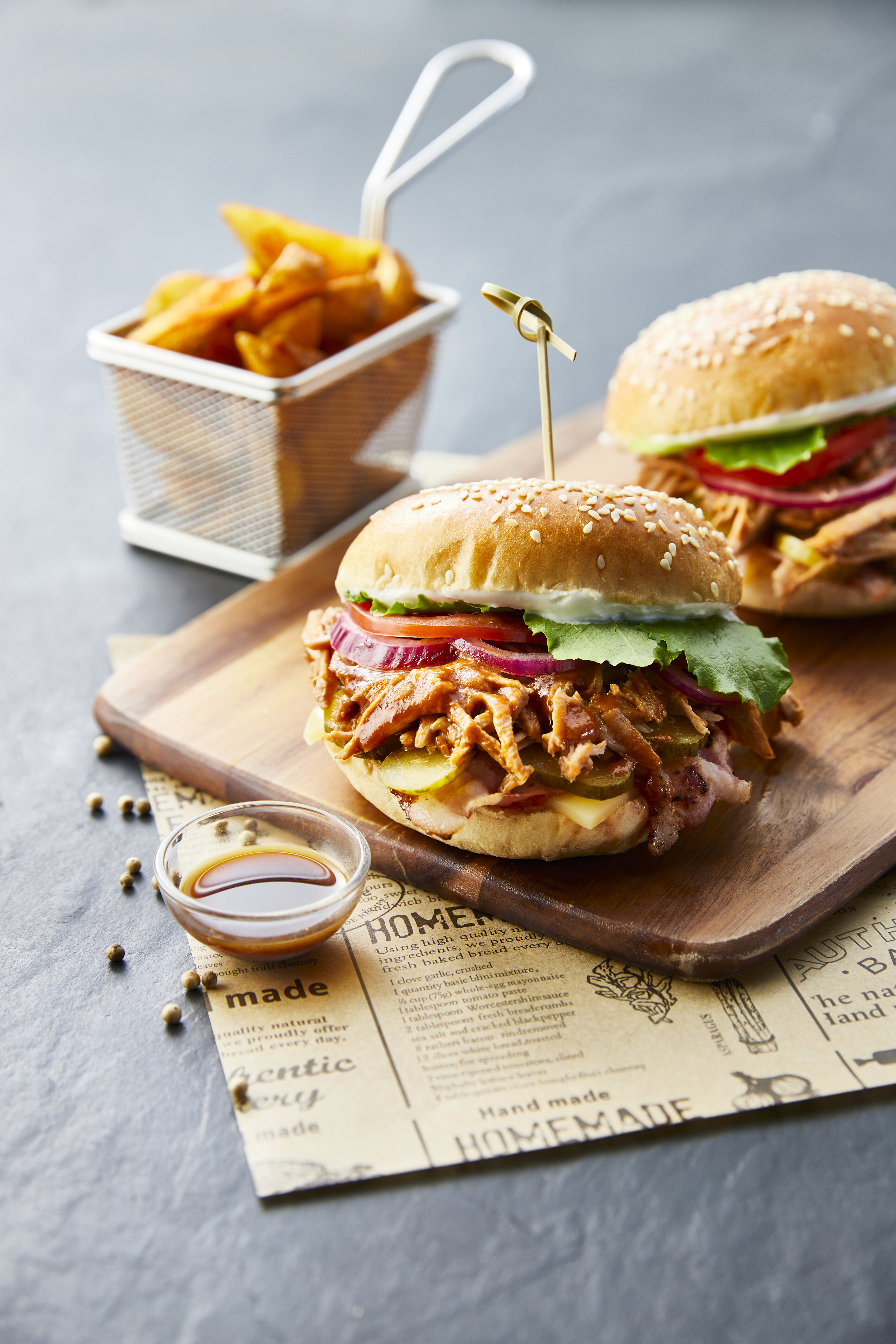 Pour finir, assemblez les burgers en disposant sur le pain du dessous : une tranche de lard grillé, une tranche de comté, les cornichons, le pulled pork, les rondelles d’oignon rouge et de tomate, une feuille de salade, puis finissez par le pain du dessus recouvert d’une cuillère à soupe de fromage blanc préalablement assaisonné.