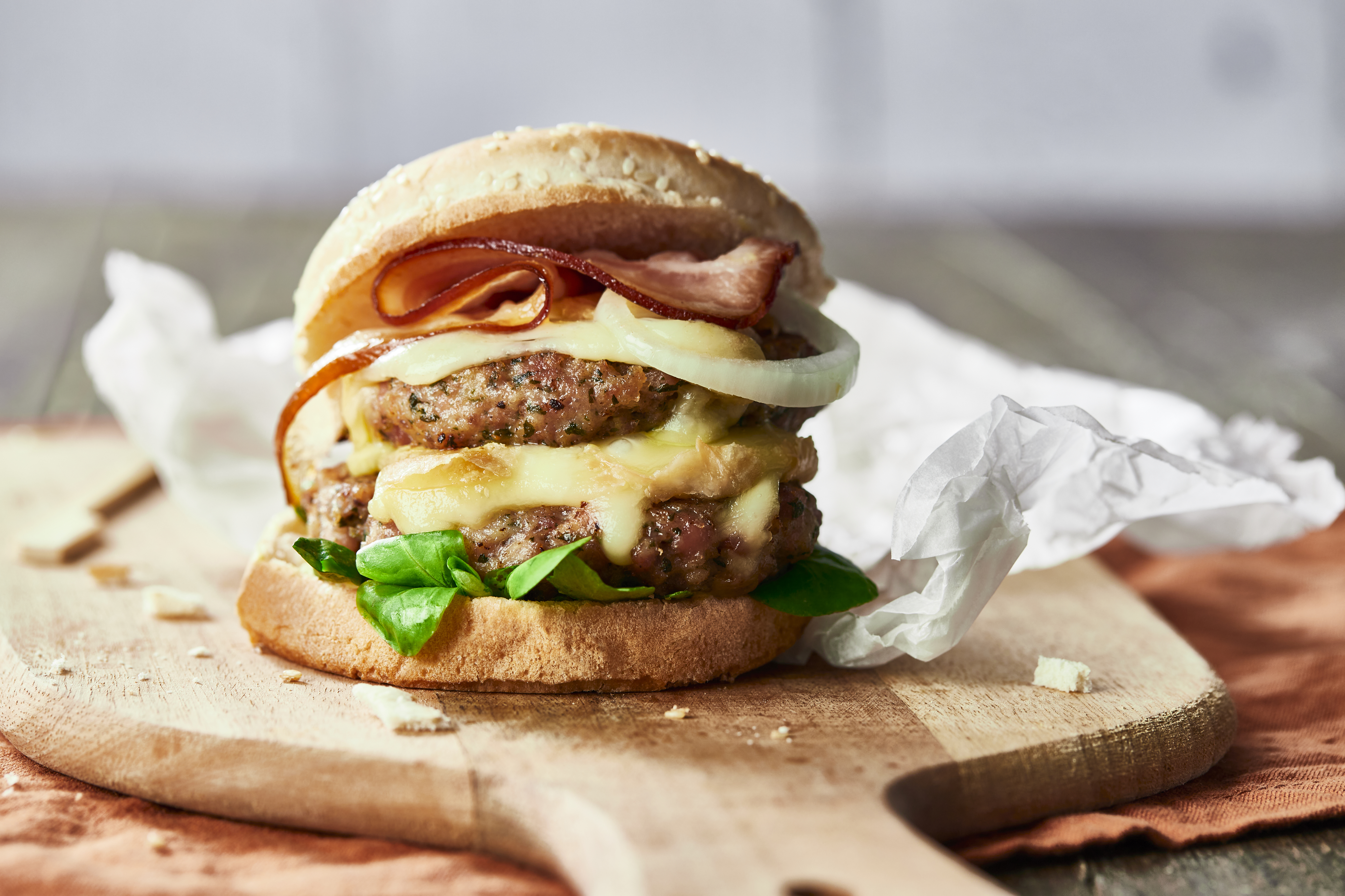 Ajoutez quelques feuilles de salade, les galettes de viande avec le munster, quelques rondelles d’oignon puis la tranche de lard grillée.