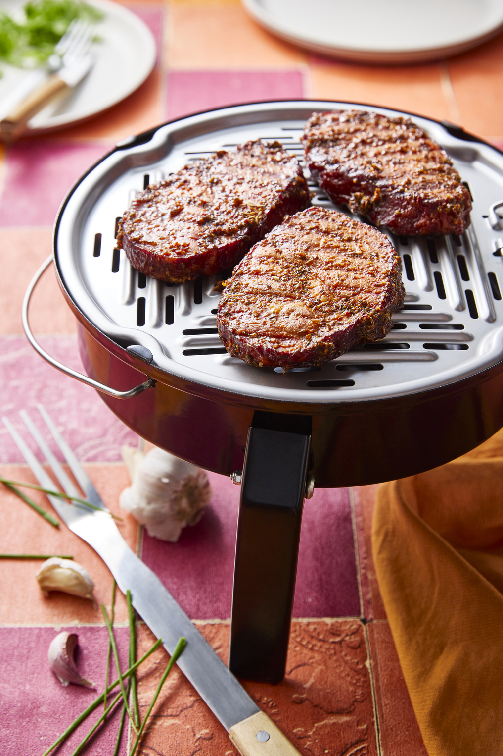 Faites griller les morceaux d’échine au barbecue et servez avec de la sauce yaourt et une salade de concombre.