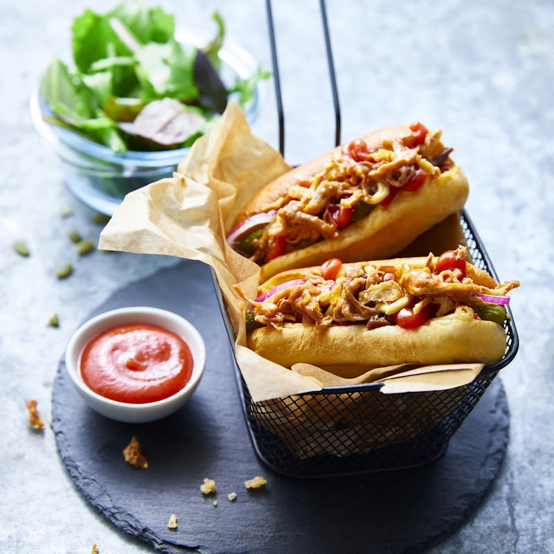 Assemblez les hot-dogs en les garnissant avec un mélange de ketchup et moutarde, le pulled pork, des tranches d’oignons rouge et de cornichons, du cheddar râpé et des oignons frits.
