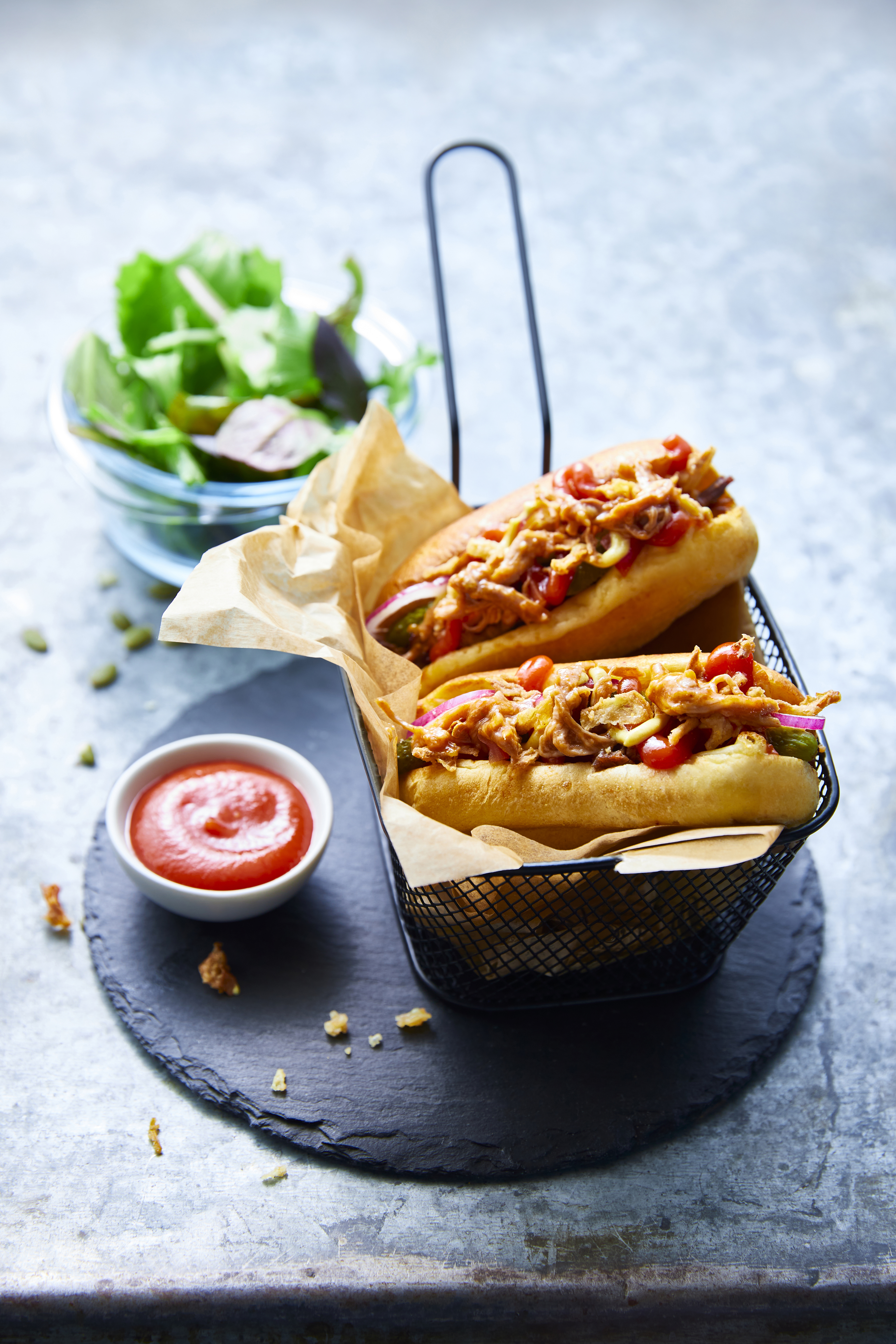 Assemblez les hot-dogs en les garnissant avec un mélange de ketchup et moutarde, le pulled pork, des tranches d’oignons rouge et de cornichons, du cheddar râpé et des oignons frits.
