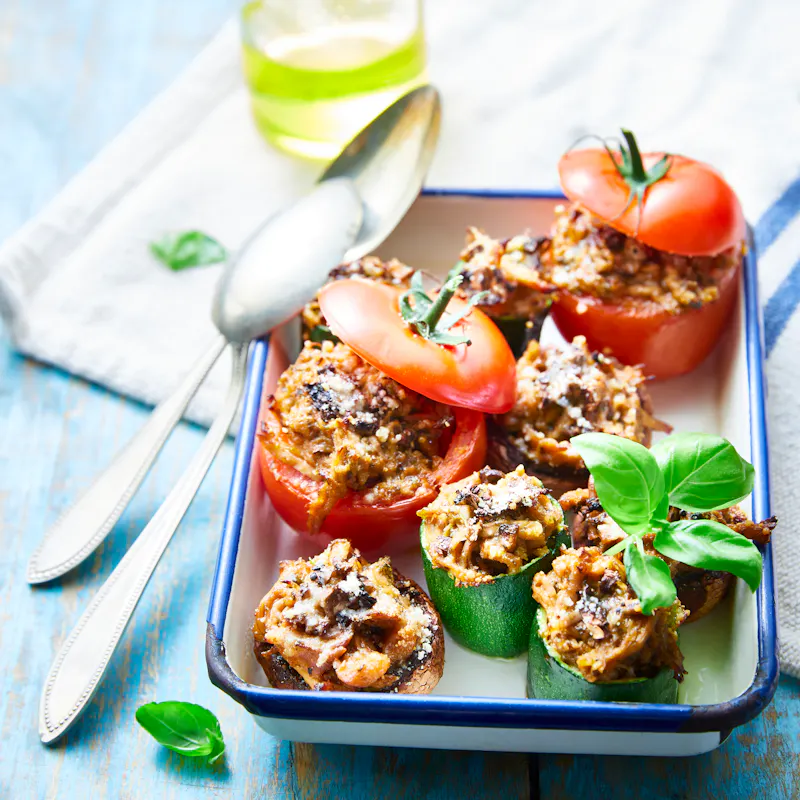 Pendant ce temps, préparez les légumes à farcir : retirez les chapeaux des tomates, coupez la courgette en tronçons d’environ 4cm et retirez les pieds des champignons. Evidez les légumes et mettez de côté leur chair.