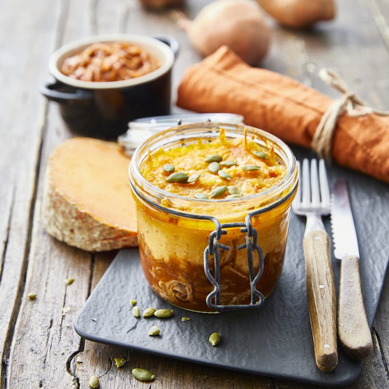 Dans un plat en verre, placez le pulled pork effiloché et recouvrez-le de la purée de patate douce. Saupoudrez le parmentier de cheddar fumé et enfournez pendant 20 minutes.
