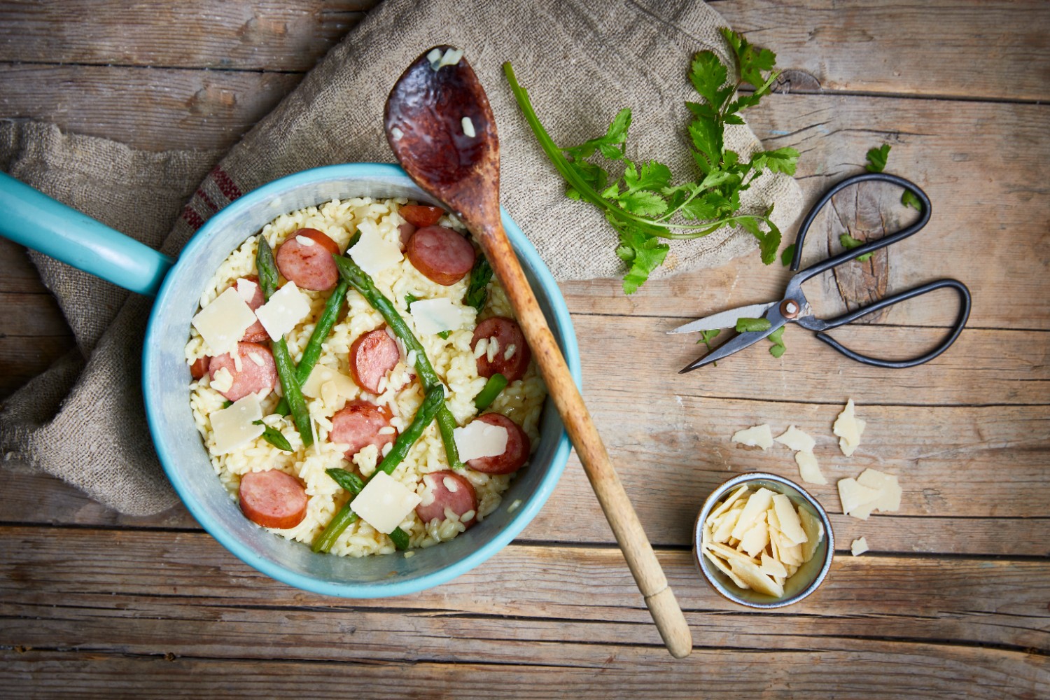 Incorporez les asperges et les rondelles de saucisse puis poursuivez la cuisson pendant 3 minutes.