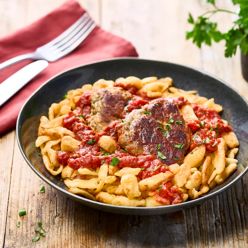 Spaetzle sauce tomate et galettes de viande à l'alsacienne
