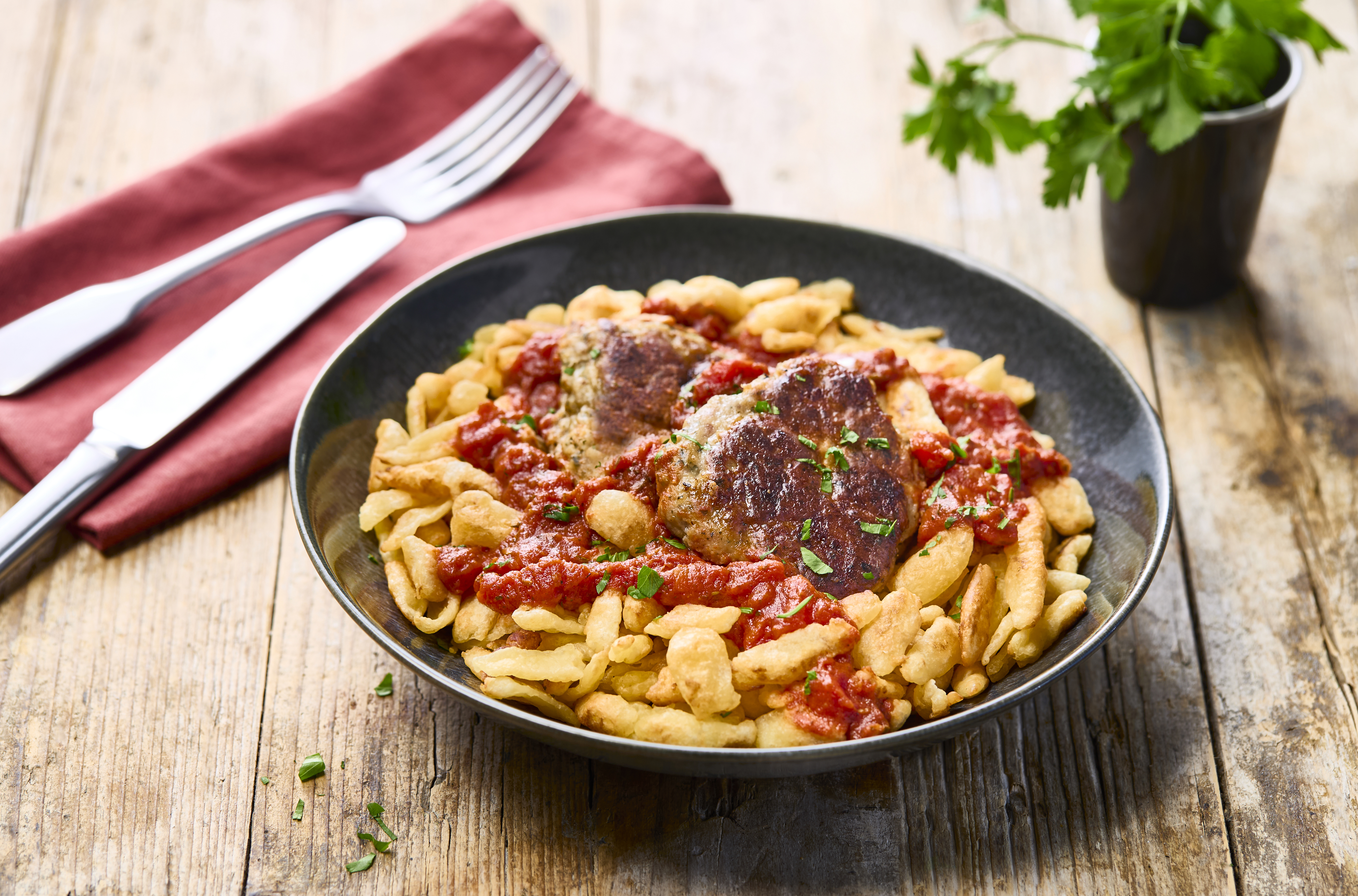 Spaetzle sauce tomate et galettes de viande à l'alsacienne