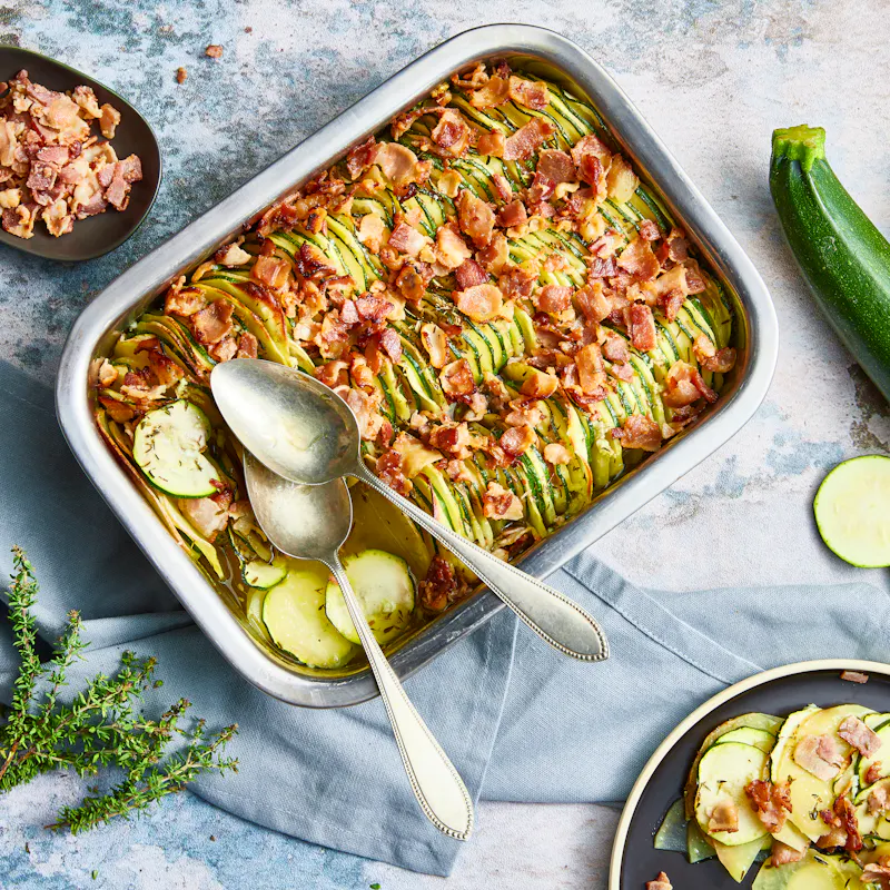 Épluchez les pommes de terre. Coupez-les en fines rondelles, ainsi que les courgettes. Disposez les tranches en les alternant debout dans le plat.