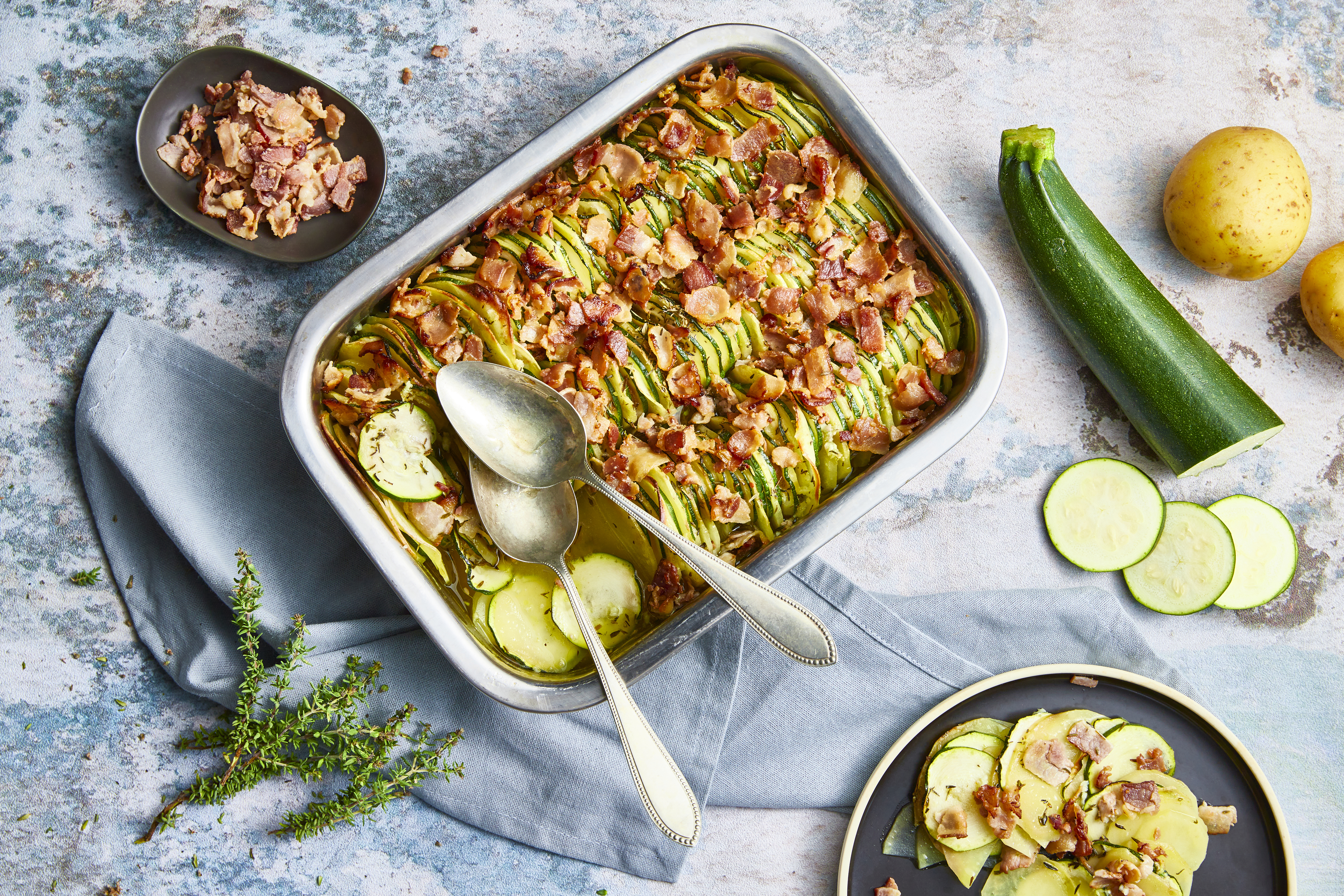 Épluchez les pommes de terre. Coupez-les en fines rondelles, ainsi que les courgettes. Disposez les tranches en les alternant debout dans le plat.