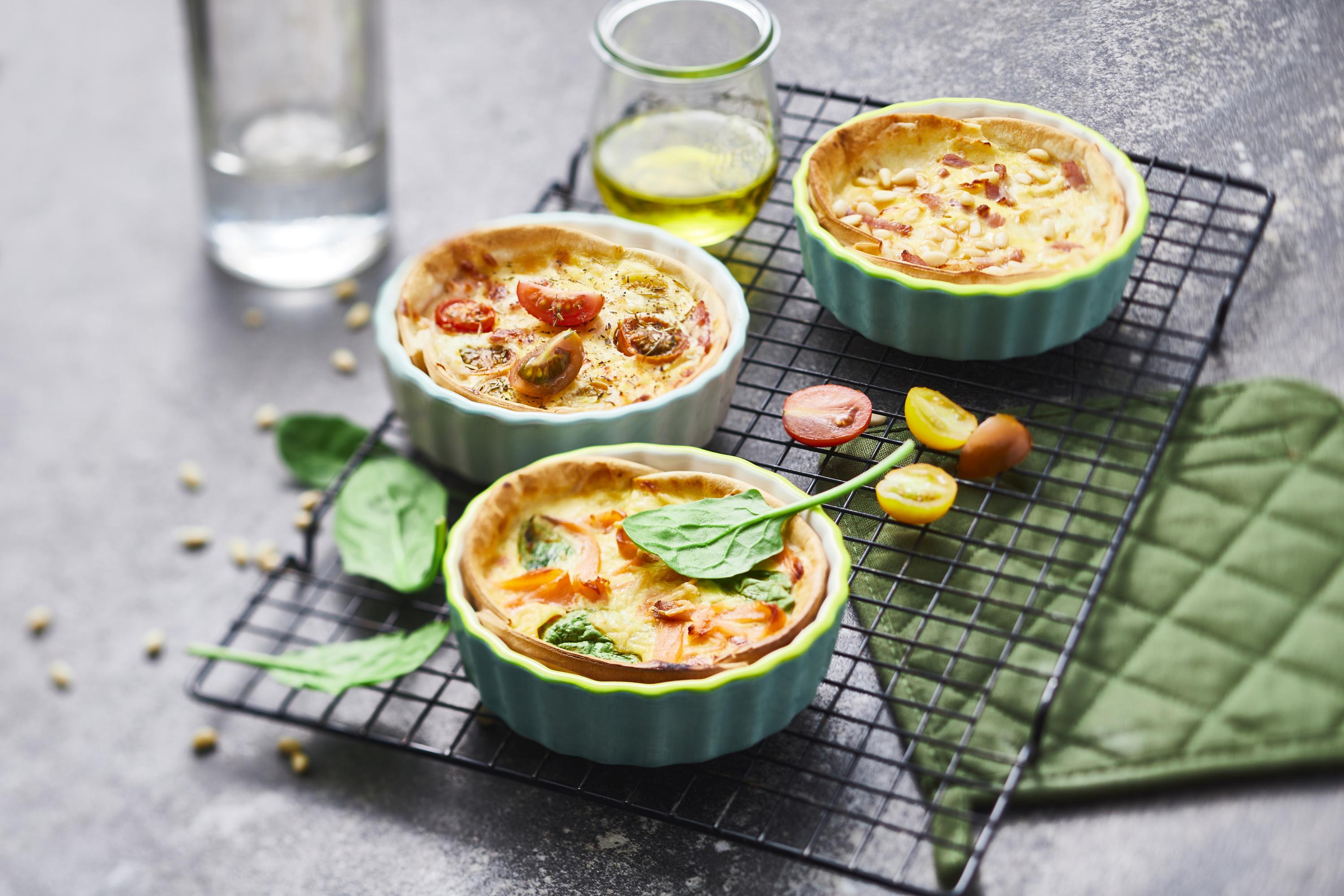 Dans des petits moules à tarte, déposez la composition de votre choix et versez l’appareil pour remplir chacun des ramequins.