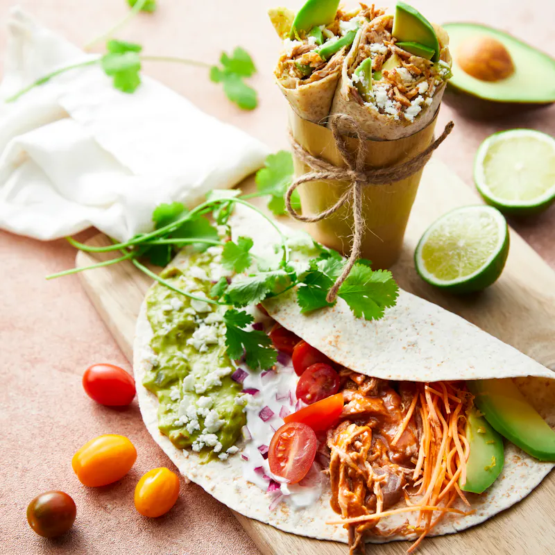 Garnissez la moitié des tortillas avec le guacamole, le fromage blanc, le pulled pork et les légumes coupés (oignon, tomates, carottes et avocats). Repliez les côtés des tortillas et roulez les wraps en serrant bien.